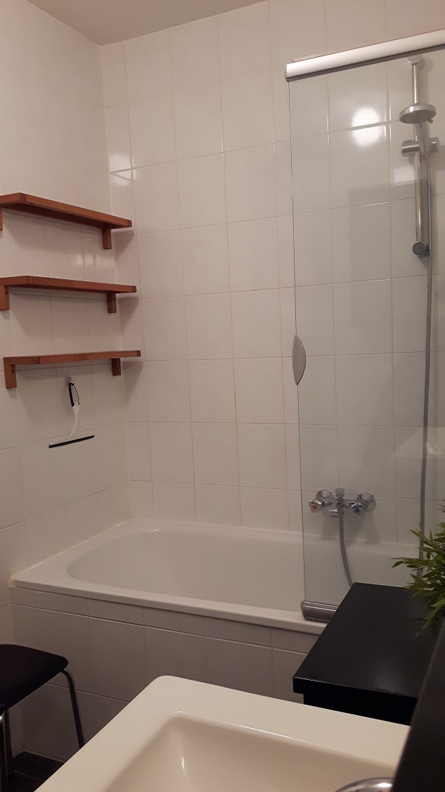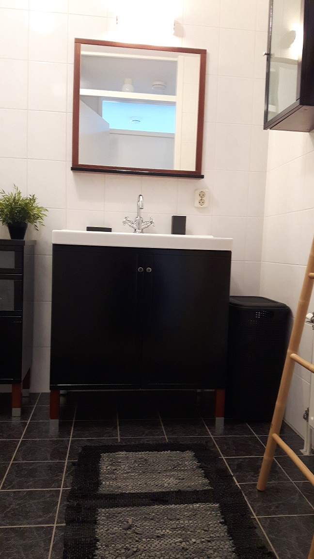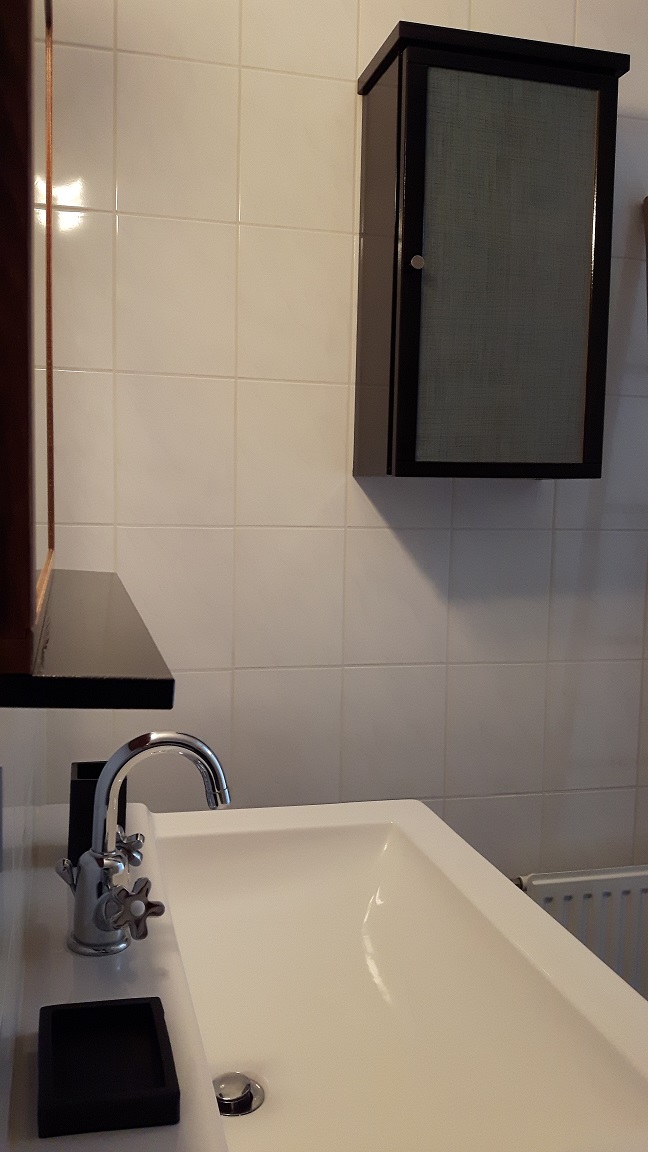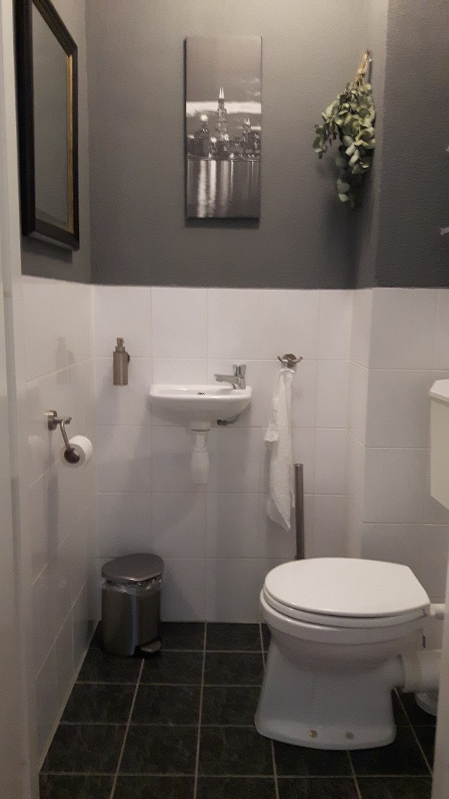 De badkamer is in een lichte kleurstelling betegeld en voorzien van een ligbad en wastafelmeubel. Direct naast de badkamer bevindt zich het toilet met fontein. Aan de achterzijde zijn de twee slaapkamers gelegen van resp. 16 m² en 11 m².