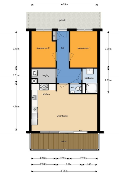 Entree, hal, toilet met fonteintje, op de zon gerichte woonkamer met veel licht, een grote schuifpui naar het balkon (12 m2), een open zeer luxe keuken met veel bergruimte, een koelvries combinatie, magnetron, oven, vaatwasser, keramische kookplaat, afzuigkap, separate bergruimte met aansluiting wasmachine en droger, 2 mooie slaapkamers, luxe badkamer met inloopdouche en wastafel. Verwarming en warm water d.m.v. CV-combiketel (2008). Het appartement is grotendeels voorzien van een nette laminaatvloer.